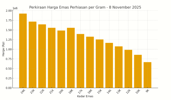 Harga emas perhiasan pada 8 November 2025 cenderung mengalami kenaikan kecil, meneruskan tren positif hari sebelumnya. Penyesuaian harga terbesar terjadi pada kadar tinggi seperti 24K dan 23K yang naik sekitar Rp 2.000 hingga Rp 10.000 per gram.